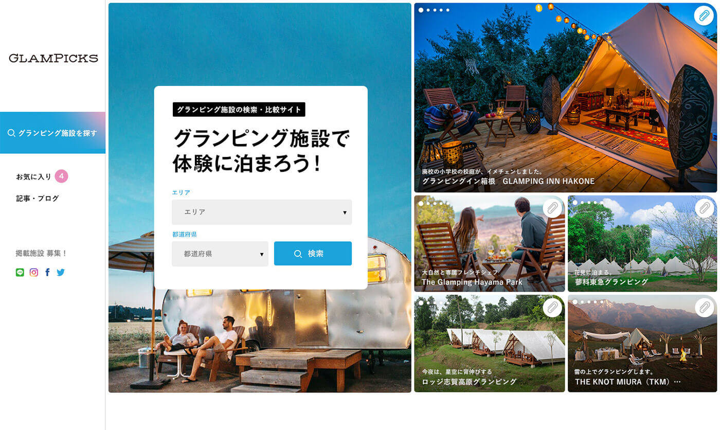 グランピング施設の検索・比較サイト「GLAMPICKS(グランピックス)」を制作しました。
