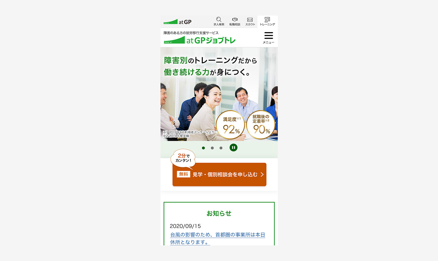 障害者向け就労移行支援サービス「atGPジョブトレ」のサイトを制作しました。
