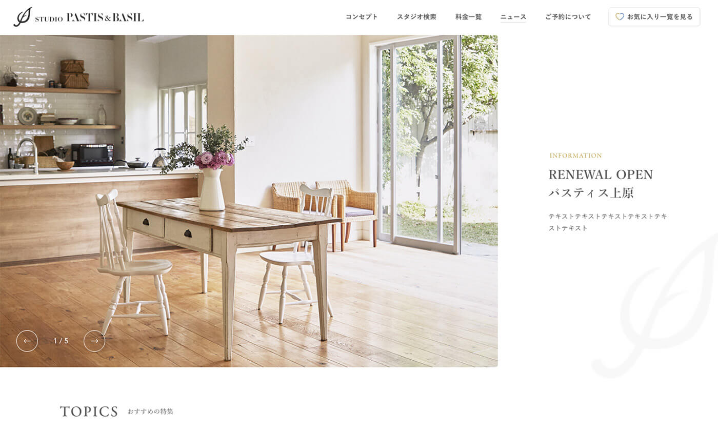 東京都内にあるハウススタジオ「パスティス&バジルグループ」のスタジオ予約サイトのトップページデザインを制作しました。
