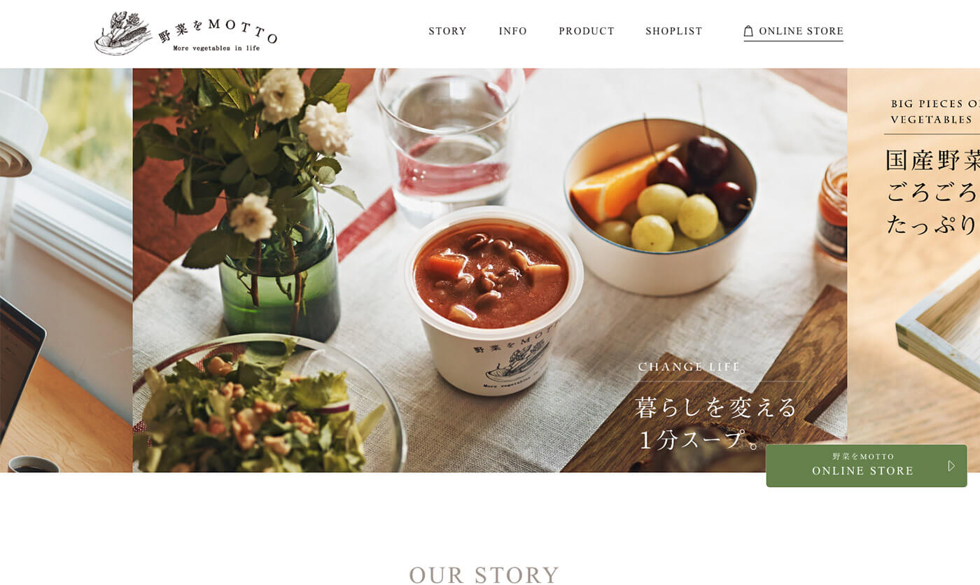 株式会社モンマルシェのスープ専門フードブランド「野菜をMOTTO」のブランドサイトのトップページデザインを制作しました。