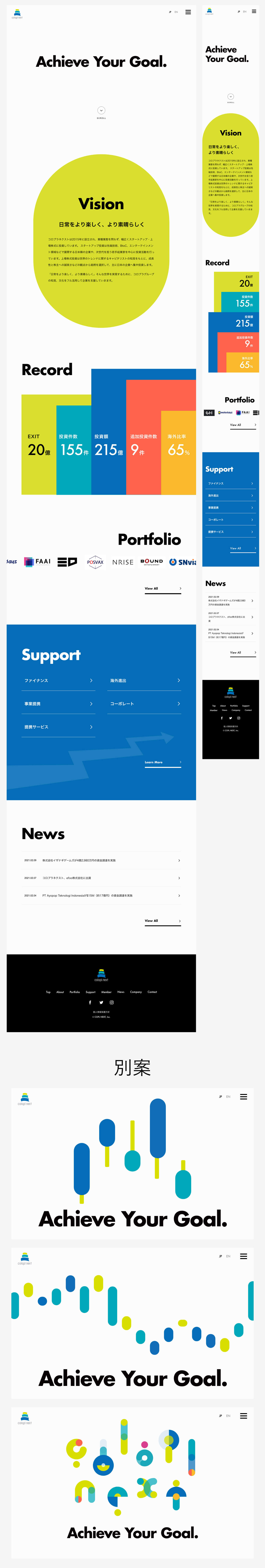 コロプラグループのベンチャーキャピタル、株式会社コロプラネクストのコーポレートサイトデザインを制作しました。「日常をより楽しく、より素晴らしく」というビジョンや、親会社であるコロプラのイメージとも連動させたポップさ・楽しさを取り入れながらも、シンプルで真摯な印象も大事にデザインしました。投資をグラフィックしたいという要望を当初は受けており、複数案提示しましたが、最終的には先方役員の意向で文字のみのシンプルなファーストビューに落ち着きました。