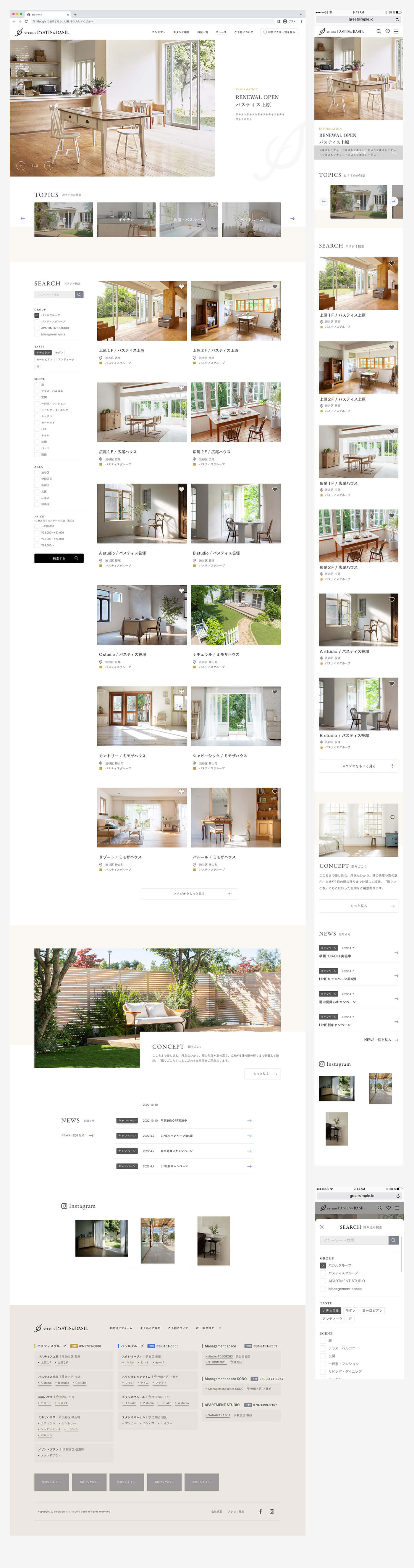 東京都内にあるハウススタジオ「パスティス&バジルグループ」のスタジオ予約サイトのトップページデザインを制作しました。デザイントンマナとしては旧サイトを引き継ぎながら、検索機能等をアップデートし、使いやすいサイトにしたいというご要望でした。検索UIはアクティブな項目をわかりやすくして使いやすさに配慮している他、ページ全体としては広めに余白をとって写真を美しく見せ、ブランドサイトとしての役割も担えるようにしています。